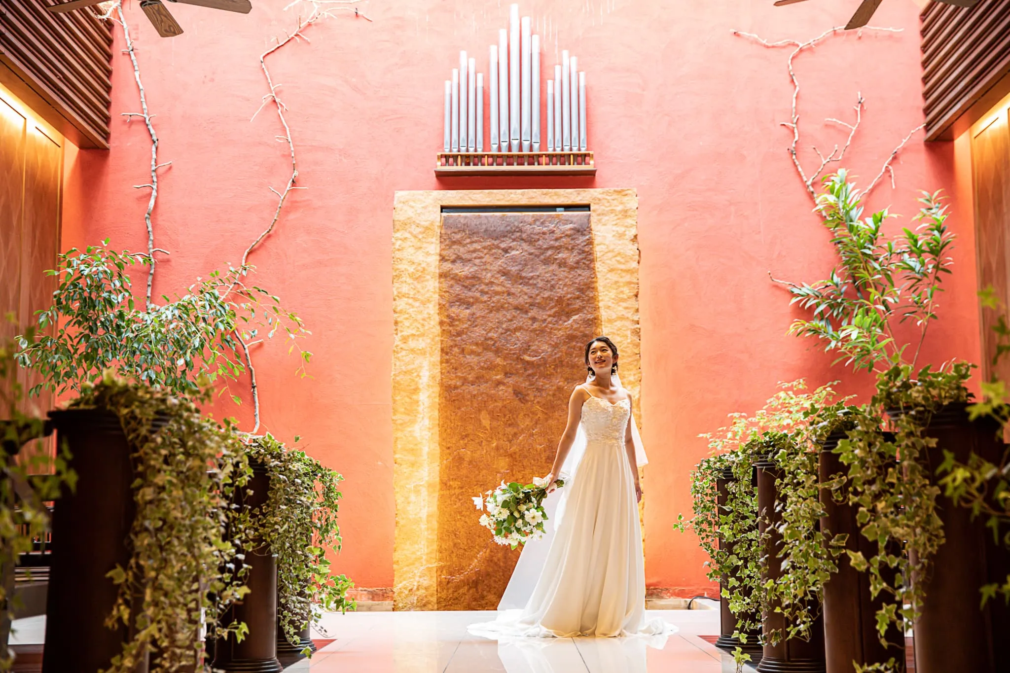 祭壇の天井からは明るい陽の光が差し込み、静かに流れる水音がゲストの心を和ませ全ての人を神聖な気持ちに導きます。